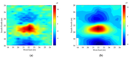 The magnetic map of the survey area obtained by the original data is shown in Figure 7a; the characteristics of the target are masked due to the low SNR of the original data. The proposed VMD-based method is applied to process the original data, then the magnetic map of the survey area is obtained by interpolating the processed data, as shown in Figure 7b. It can be clearly found that the quality of the processed data has been greatly improved compared with the original data, which lays a foundation for the further interpretation.