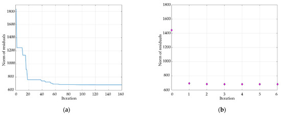 The variation of the norm of residual error with iterations when using (a) DE algorithm and (b) the proposed method.