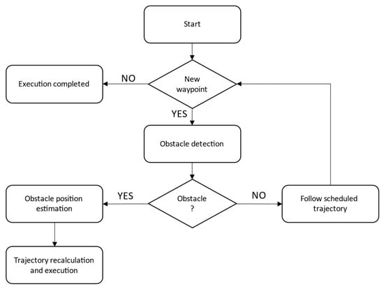 A scheme of the implementation is presented in Figure 1 in the form of a decision tree. The same procedure is applied when the UAV reaches a waypoint of the trajectory. First, the drone takes samples of the room to detect whether there are any obstacles, and if so, it registers its position during a certain period of time, otherwise, the scheduled trajectory is followed. If a new obstacle is detected, a polynomial regression is performed, fitting the measurements of the sensors, to forecast its future position. Furthermore, a security distance is assigned as a function of the size and speed of the object. The position of this new obstacle is introduced into the optimization program, which recomputes the new trajectory profile considering its presence and using as the initial guess for the iterative method, the scheduled trajectory. The process finishes once the UAV reaches the final waypoint of the trajectory. As well as the trajectory of the UAV, the motion of these obstacles and the sampling process of the sensors are simulated, as explained in Section 2.2.2.