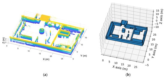 - Hall of the School of Mining and Energy Engineering at University of Vigo. It is a scene with many obstacles and a low ceiling, in which it is practically impossible to overfly any obstacle (Figure 2a). This point cloud was captured with the MLS ZEB-REVO laser scanner [43].