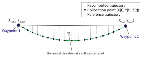 To solve this time-continuous problem, a direct approach was implemented. The trajectory in Cartesian coordinates is sampled in a discretized time-grid (Equation (3)). The number of collocation points is a parameter that can be defined by the user, or adapted dynamically, depending on the required spatial and temporal resolution. In this way, the set of coordinates for the temporal steps can be grouped in the following arrays of decision variables: