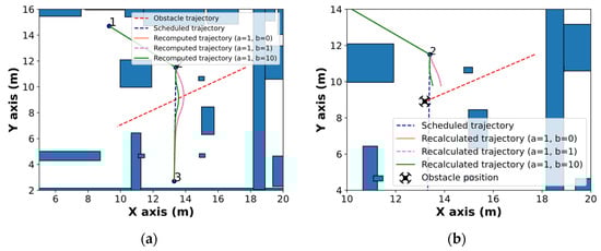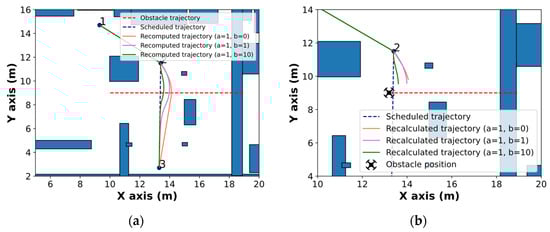 Figure 10 represents the different approaches in this avoiding maneuver when using different settings of parameters a and b. For b equal to 0, the algorithm prioritizes the time of flight and creates a path at the maximum allowable speed of the UAV, for that, it takes a certain deviation from the original trajectory to maintain the safety distance from the obstacle. When increasing the value of b, the trajectory becomes straighter, and the UAV reduces its velocity and allows the other obstacle to cross the intersection. For larger values of b, the trajectory would practically be a straight line.