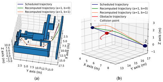 Two additional cases were simulated in the MTI building to demonstrate other types of maneuvers such as vertical avoidance and obstacles following curved accelerated trajectories (Figure 8). In these test cases, the obstacle was detected between the first and second waypoint, and in an equivalent way as for the previous scenarios, the avoidance maneuver can be calculated: