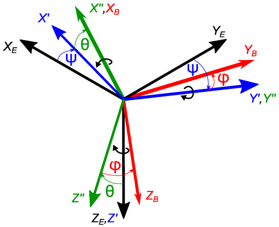 After that, the transformation from NED to body frame can be obtained as a sequence of three ordered rotations (Figure 2), called [63]: