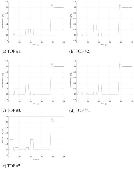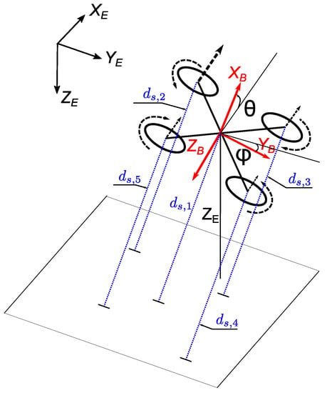 The use of several devices allows to measure the distance to ground from several points on the vehicle, resulting useful to improve attitude estimation. Consider TOF devices mounted on the UAV structure and pointed towards the positive axis direction. Let , be the position of the i-th device in the body reference frame. During the flight, the position of the sensor in the inertial reference frame is