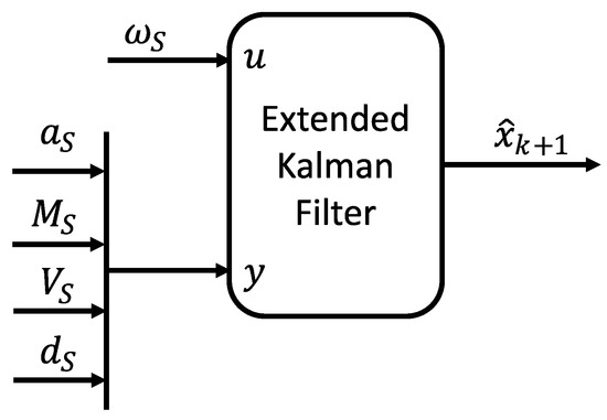 where is the state vector, is the input vector, and is the process noise. Similarly, Equations (10), (15), (16) and (18) can be written in the following form: