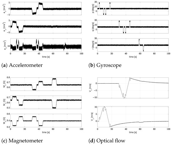 Usually, in slowly varying conditions, the accelerometer and the magnetometer can be used to estimate the gyroscope biases and compensate the attitude drift, being their measurements dependent from the UAV orientation [67,68,69]. The gyroscope bias is commonly modeled as a first-order Gauss-Markov process [70,71], with a first-order stochastic differential equation given by