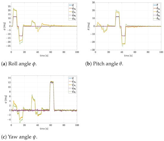 Euler angles , and describe the aircraft attitude. An alternative representation makes use of the quaternion definition [17,64], considering as the unit quaternion vector associated to from the NED reference frame to the body frame: