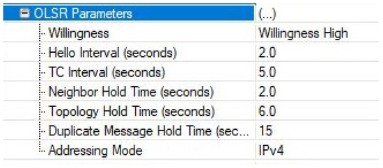 Most of the literature focuses on improving OLSR by improving the MRP selection criteria [33] or willingness concept [34]. Barki et al. [35] provides a brief survey of OLSR improvement based on MRP selection. Improving performance by tuning parameters is also an efficient method to enhance the protocol performance. The new protocol needs extensive examination and analysis before practical deployment. In this context, parameter tuning is faster and more reliable for deployment [36]. Using a tuning strategy, this research improves the performance of the OLSR. An extensive simulation has been performed based on the heuristic method to find the optimal value for the UAV network. Table 1 represents the values for standard OLSR routing protocol parameters [37], whereas Figure 1 demonstrates E-OLSR values. The E-OLSR considers willingness to be high (6) rather than the default value of (3). Willingness indicates the node’s desire to forward traffic on behalf of other nodes. Batteries, power, and capacity are related to it. In UAVs, willingness is crucial, as many nodes do not want to send traffic due to preserving energy, which is called a “selfish node” [38]. A high willingness indicates that the node will actively perform data transmission and perform an MRP. It improves the possibility of better system performance. In the OLSR packet format, there are two types of holding time. Htime corresponds to the HELLO message, while Vtime refers to the data packet. Holding time holds five types of time in the message header: neighbor hold time, topology hold time, duplicate message hold time, message id hold time, and HNA message holding time. The link expiration time is specified by the neighboring hold time. If a HELLO message is not received on a link within this time frame, the link is declared lost. By reducing neighbor hold time (6 s for standard OLSR, reduced to 2 s in E-OLSR), the lost node is detected faster instead of waiting a long time. It improves UANET system throughput. The expiration time for topology table entries is defined by the topology hold time. TC messages refresh topology table entries based on their originator address and sequence number.The topology hold time in E-OLSR is reduced from 15 s to 6 s. The topology of the UANET changes frequently. If the topology changes, UAVs receive updated information more quickly in E-OLSR because of the short topology hold time. The duplicate message hold time specifies the expiration time of a duplicate set table entry. In order to avoid handling duplicate messages received within this time frame, a duplicate set table is used. The duplicate message hold time in E OLSR is reduced from 30 s to 15 s. An analytical comparison between all routing protocols is illustrated in Table 2: