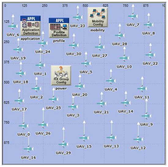 There are four simulation scenarios considered in this study, as described in Table 4. The network model of UAVs developed in the OPNET simulator is shown in Figure 2. The network model in Figure 2 contains 30 nodes as represented by UAV-1, UAV-2, …, and UAV-30, which are placed randomly within a 1000 m × 1000 m geographical area. For scenarios 1 and 2, UAV speed is considered at 40 m /s and an altitude of 200 m. Moreover, in scenarios 3 and 4, UAV speed is applied at 30 m /s and an altitude of 50 m. Extended rate PHY327 (802.11 g) is used as the underlying MAC layer with a data rate of 24 Mbps for scenarios two and four. In the same manner, 1 Mbps data rate is used for scenarios one and three. AODV, OLSR, DSR, GRP, and E-OLSR are considered as routing protocols’ performance comparisons.