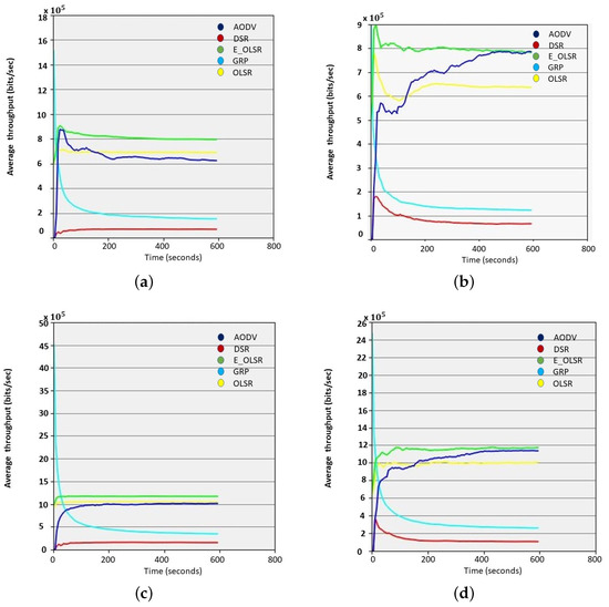 Average throughput comparison of different routing protocols. (a) Scenario 1. (b) Scenario 2. (c) Scenario 3. (d) Scenario 4.