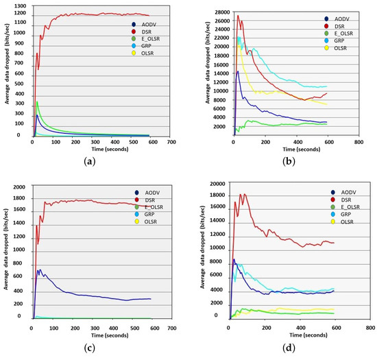 Figure 6 compares the average data dropped by E-OLSR, AODV, DSR, OLSR, and GRP when the number of nodes and data rate become varied. As observed in the contrast between Figure 6b,d, when node density is low, the data drop rate increases dramatically. From Figure 6a,b, it can be observed that the data drop rate increases with an increasing number of nodes. The UANET, based on the E-OLSR routing protocol, offers the best data drop rate performance compared to four existing routing protocols. However, DSR shows the worst result in all situations compared to other protocols. Furthermore, GRP also shows an increasing data drop rate at a high data rate Figure 6b,d.