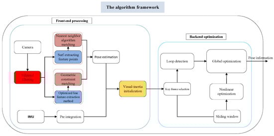 This paper mainly studies image processing algorithm and visual inertial initialization algorithm at front-end, and the traditional nonlinear optimization framework at back-end. The main contribution is the colored part in Figure 1. As shown in Figure 1, the algorithm is established based on the PL-VIO algorithm. This study focuses on the point and line feature extraction and matching algorithms of data preprocessing module: