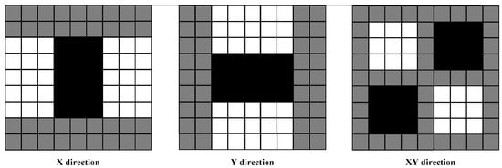 The algorithm uses a Box filter to approximately replace the Gaussian filter. Therefore, it multiplies with the weight coefficient 0.9 so as to even out the errors caused by the Box filter. In discrete image pixels, an image processing template can be used instead. For example, the templates in X direction, Y direction and XY direction are shown in Figure 3. We calculate through the template in direction, through the template in direction and through the template in direction. Finally, the value of the determinant of the Hessian matrix for each pixel can be obtained by taking it into Formula (4).