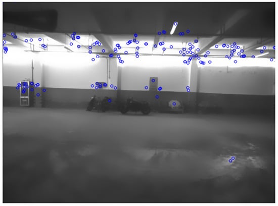In the point feature extraction algorithm, the Hessian value of the SURF is set to 800, and the results of the original extraction algorithm are shown in Figure 4. After the bilateral filtering of the SURF algorithm is shown in Figure 5, the reduction of invalid point features on the white wall and ground can be seen.