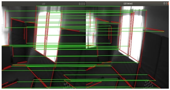 As shown in Figure 8 [], in weak texture scenes with weak light and poor features, the adjusted LSD algorithm can still obtain clear line features. Although the number of line features is relatively reduced, the matching time is reduced from 70 ms to 20 ms (seen Figure 9).