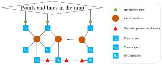 In this section, the parameter and deviation of visual inertia are estimated by means of a step-by-step joint initialization method referring to the initialization method in ORB-SLAM3 []. Visual-inertial Bundle Adjustment (BA) optimization is first used to form an initial map consisting of multiple poses of camera and sparse point clouds. The camera pose was fixed in the map, and was used to calculate the IMU motion residual in the second stage.