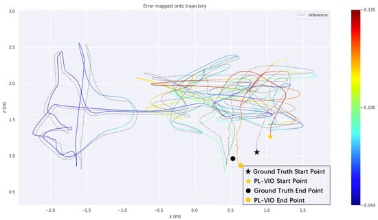Figure 12, Figure 13 and Figure 14 represent the Absolute Pose Error (APE) of the two sequences. The gradient color band from dark blue to red in the figure represents the Error size, and the values at the top and bottom of the color band are the maximum and minimum values of the Error. The closer the track color is to dark blue, the smaller the error between track and true value is. V1_03_difficult sequence is a data set of indoor motion and fuzzy illumination. Figure 11, Figure 12 and Figure 13 respectively show the comparison of plane trajectory and real trajectory of this algorithm and PL-VIO under this sequence. The absolute pose error of VINS-Mono, PL-VIO and our algorithm is 0.236 m, 0.190 m and 0.148 m respectively. It can be seen that the gap between the algorithm in this paper and the truth value is closer and the stability is higher.