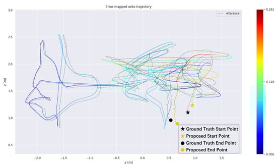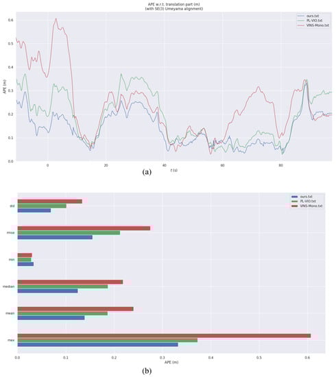 Figure 15a shows the real-time absolute pose error. It can be seen that the trajectory of the proposed algorithm is smoother than that of the other two algorithms. Figure 15b shows the root mean square error, median error, mean error, extreme error and sum of squares of error of the three algorithms. The algorithm in this paper is optimal in all indicators.