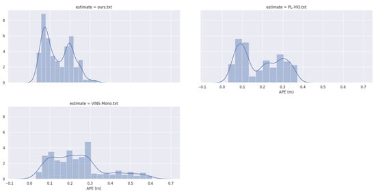 The experiments are accomplished with the DJI Manifold2-C computer, whose configuration is as follows: the CPU is the Intel® Core™ i7-8559U processor; the main frequency is between 2.7 GHz and 4.5 GHz; the memory is 8 G; the computer has no GPU; its system is Ubuntu 16.04 LTS 64 bits with ROS Kinetic. To evaluate the algorithm, we use the public dataset EuRoC [], which contains 11 data sequences of the three grades: simple, medium and difficult. The comprehensive consideration of illumination, movement speed and other flight conditions can thoroughly evaluate the performances of the algorithm.