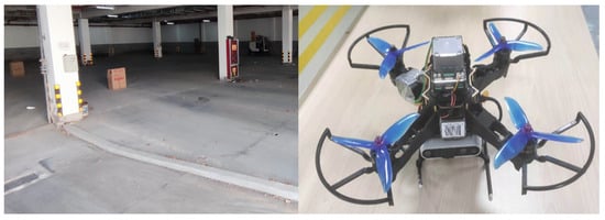 The experimental site is the underground parking lot of Northwest China University of Technology. The test scene is relatively empty and surrounded by white walls, so it is difficult to extract point feature. The light intensity of different positions and the speed of UAV flight is not fixed, which is a challenge for the algorithm performance. To verify the performance of the algorithm in actual weak-textured environment, a quadrotor drone is equipped with a smart computing host and a D453i camera (camera frame rate 30 Hz, IMU frame rate 200 Hz). The three algorithms were tested online. The experimental field and the experimental acquisition equipment are shown in Figure 17.