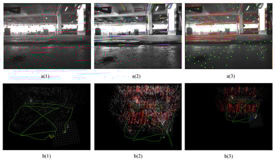 Actual scene experiment. a(1) VINS-Mono algorithm for feature extraction of images in real scenes. a(2) PL-VIO algorithm for feature extraction of images in real scenes. a(3) The proposed algorithm for feature extraction of images in real scenes. b(1) The real-time localization trajectory of VINS-Mono algorithm is in the actual scene. b(2) The real-time localization trajectory of PL-VIO algorithm is in the actual scene. b(3) The real-time localization trajectory of the proposed algorithm is in the actual scene.