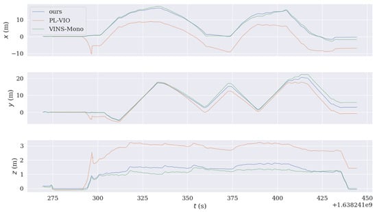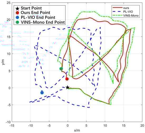 Based on Figure 19, it can be seen that the positioning results of the PL-VIO system began to drift after the aircraft took off, because the SLAM system with line features could not calculate all the initialization parameters within a short time after startup. After running for a while, the system stabilizes as new features are added. The algorithm in this paper optimizes image processing and initialization, so that the system can calculate accurate initialization parameters in a short time. Therefore, the trajectory of UAV is stable and the positioning accuracy is relatively high after startup. Although VINS-Mono does not diverge, its positioning accuracy is not as high as that of the proposed algorithm.