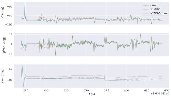 According to the alignment and pose error of the algorithm in data 3 in Table 1 under EuRoC data set, it can be concluded that the point-line features of MH_01_easy and V2_01_easy are sufficient, full of light and without fast motion. However, the advantages of this are mainly aimed at scenes with missing texture and fast movement, so the PL-VIO positioning accuracy in these two data sets is higher than that of the algorithm in this paper. The algorithm of this paper is optimal in all other scenes. In the MH_04_difficult sequence with missing scene texture and V1_03_difficult sequence with fast camera movement, the algorithm presented in this paper shows excellent accuracy.