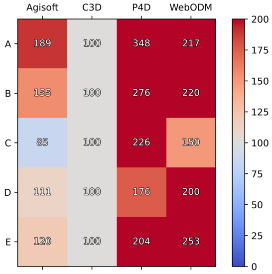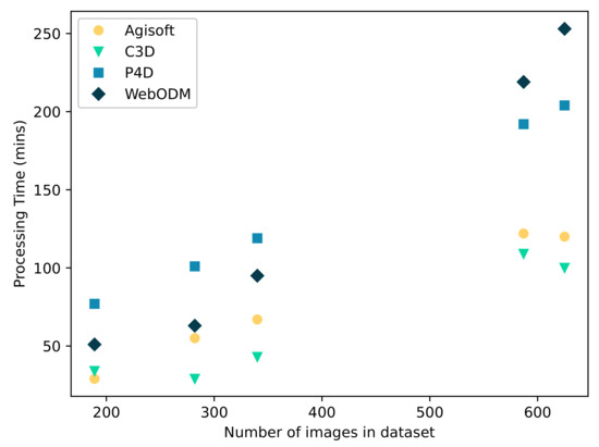 Unsurprisingly, the total processing time was closely and linearly related to the number of images processed (Figure 2). In most cases, C3D was the fastest-performing software package, followed by AgiSoftMS. With the three smaller datasets, P4D was the slowest-performing software; however, with the two larger datasets, WebODM became the slowest. It is likely that the slow performance of WebODM for large datasets was due to it using the CPU for processing, while the other three packages are able to access the GPU for higher performance. Of particular note, P4D had a processing time of up to 348% more than that of C3D (Figure 3). The longer processing time for Pix4D is likely related to the additional processing steps requiring the software to generate a 3D mesh and also automatically exporting the DEM and orthomosaic. These features are not included in the recommended templates for the other packages, where 3D models are not required or where the export of files occurs after the processing stage. There was only one case where Correlator 3D was outperformed on speed (Dataset C—Trinity Park), where AgiSoftMS processed these data in 29 min compared to 34 min, or 85% of the time taken for C3D (Figure 3).
