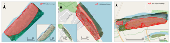 AgiSoft vs. P4D with Dataset B (left), Dataset C (middle), and Dataset E (right). The red shade and the inset at the bottom right corner are the coverage of the orthomosaic generated by P4D. The red cluster scattered in the shade is voids that have no value in the orthomosaic datasets. This is overlaid with the output from AgiSoft to show the difference of coverage.