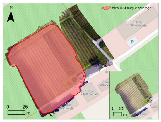 AgiSoft vs. WebODM with Dataset A. The red shade and the inset at the bottom right corner are the coverage of the orthomosaic generated by WebODM. The red cluster scattered in the bottom right edge of the shade is voids that have no value in the orthomosaic datasets. This is overlaid with the output from AgiSoft to show the difference of coverage.