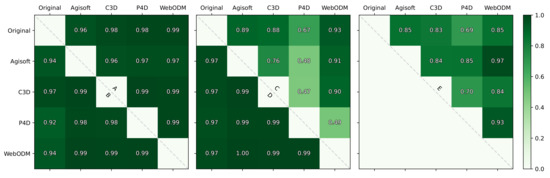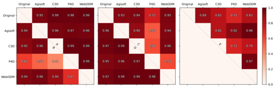 Correlation score of green pixel luminance values. The results from each dataset comprise half of the square presented, separated by the diagonal dashed line and labelled with the corresponding letter. Both columns and rows are labelled with orthomosaic sources, and “Original” refers to the original drone images. Darker shading denotes a higher correlation score, i.e., similar luminance value density.