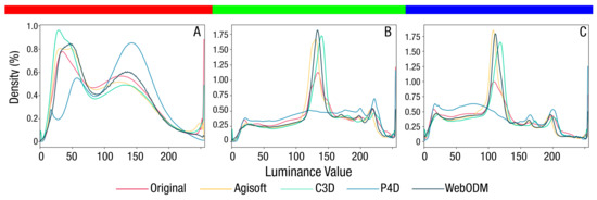 A subset of colour density histograms that show the most variance (i.e., lowest correlation score) between different software packages and original drone images. (A) Red channel colour density plot for Dataset B, where the lowest score (0.55) occurs between P4D and AgiSoft outputs. (B) Green channel colour density plot for Dataset C, where the lowest score (0.47) occurs between P4D and C3D outputs. (C) Blue channel colour density plot for Dataset C, where the lowest score (0.39) occurs between P4D and C3D outputs.