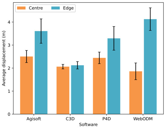 In contrast, at the orthomosaic edges, P4D, AgiSoftMS, and WebODM showed slightly larger displacement from the satellite features (Pix4DMapper: 3.29 ± 0.51 m, AgiSoftMS: 3.61 ± 0.53 m, WebODM: 4.13 ± 0.49 m). C3D, however, displayed similar displacement at the orthomosaic edges to the centre, (2.12 ± 0.16 m), making it the nearest to the satellite imagery at the orthomosaic edges. Interestingly, while WebODM appeared to be nearest to the satellite imagery in the centre of the orthomosaic, displacement at the edges was the furthest, at 2.2-times further from the satellite imagery than the centre features.