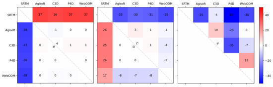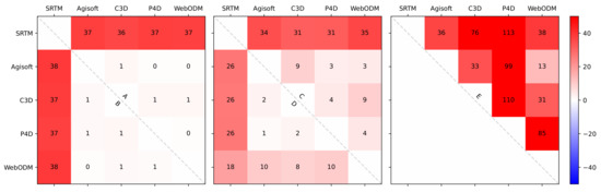 When using similarity metrics to evaluate the output DSMs, we found that there was very little overall difference between the software outputs except Dataset E, though all differed somewhat from the SRTM data. The MAE (Figure 13) and RMSE (Figure 14) had little difference in Datasets A, B, and D, between comparison pairs, which indicates that the difference between all the pixels was fairly even. A mixture of terrestrial and aquatic features yet led to a greater variance of the difference (the RMSE of Datasets C and E was higher than the MAE). The depth (or “negative elevation”) of underwater features was inadequately represented across all models, though none of them boast a capability in this respect, and bathymetric LiDAR would certainly be a better option for deriving depth information [67].