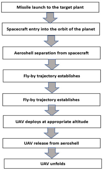 Figure 2 shows the system model for UAV deployment on Mars. The aeroshell separates from the spacecraft after the missile is launched to the targeted planet, and the spacecraft enters the planet’s orbit. The spacecraft performs a quick burn to set up a fly-by trajectory to release the aeroshell on an entry trajectory. The aeroshell should normally reach the atmosphere of the targeted solar at a shallow angle. Due to the shallow entry angle, space UAVs will deploy at sufficient altitudes to meet the flight level. After the deployment is complete, a pull-up operation is performed to determine the controlled flight level. In other words, the UAV should detach from the aeroshell during the deployment process. It should then deploy its tail and wings. UAVs should also recover from a dive while retaining as much altitude as possible.