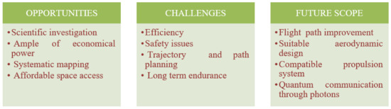 Furthermore, sending astronauts on a space mission causes severe health issues. As discussed earlier, these health issues can have both short-term and long-term effects. An example of human life at risk is, at NASA, a total of 17 astronauts lost lives in the Space Shuttles Challenger and Columbia tragedies and the Apollo launch pad fire in 1967 [65]. Furthermore, sending human pilots on the spatial body will reduce the station timings. When landers, orbiters, rovers, and human crew are limited, UAVs may be used to accomplish many mission objectives. Exploring the spatial body through UAVs will clearly give more station time, cover the more significant part of the body, and thus, provide huge information [61]. The use of UAVs would balance the analysis, risk of execution, and expense in the field of space exploration. Unlike orbiters, UAVs are nearer to the celestial body’s surface; therefore, the information will be comparatively more accurate.