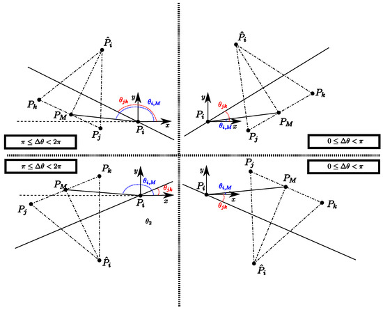 In accordance with Equation (2), as shown in Figure 1, the resulting triangle P j P ^ i P k is an isosceles.