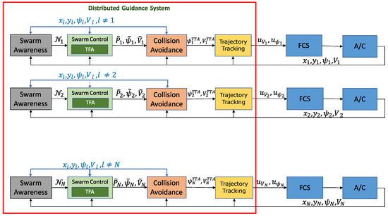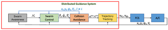 A different concept arises, especially with a (large) number of aircraft in swarms, where guidance does not care about flying in a shaped formation but is focused on collective behaviors and, in particular, on scalability and decentralization issues [43,44,45].