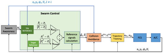 A Swarm Control Algorithm (SCA) aimed at calculating the next desired position P ˜ i ( t ) and speed V ˜ i ( t ) , at each time instant, in order to reach the target area at P f and keep the aircraft within the formation.