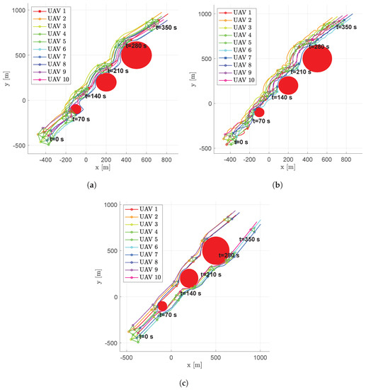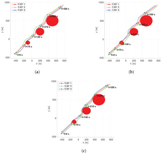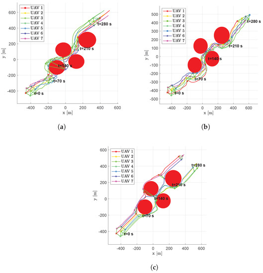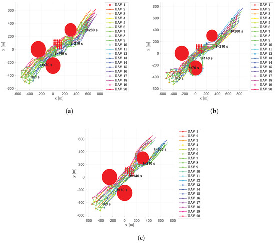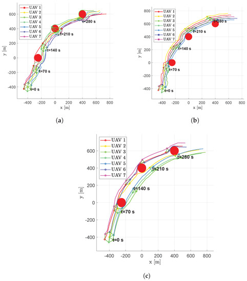 Figure 21. Scenario #4—7 aircraft: UAV’s trajectories. Obstacles are represented in red, colored circular markers indicate positions of followers at different time instants, whereas colored square markers are for the leader. Green straight lines are used to highlight the connection graph. (a) Fixed leader–follower SCA. (b) Free leader–follower SCA. (c) No Leader SCA.