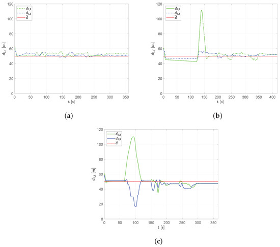 • Near obstacles, the mutual distances among aircraft tend to increase, being very different from the desired value; however, some differences can be observed: the fixed leader architecture makes the flight formation more compact, forcing aircraft to maintain the formation shape for a longer time, while the free leader and no leader schemes allow the spreading of the formation near obstacles. It is worth noticing that the no leader architecture not only provides more regular (straight) trajectories, but it allows faster recovery of the desired distances once the obstacle is passed compared to the free leader scheme. In such a case, in fact, the selection process of the leader tends to delay the air vehicle’s rendezvous after the flight formation spreads in the presence of obstacles.