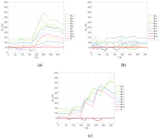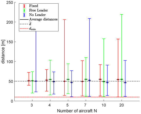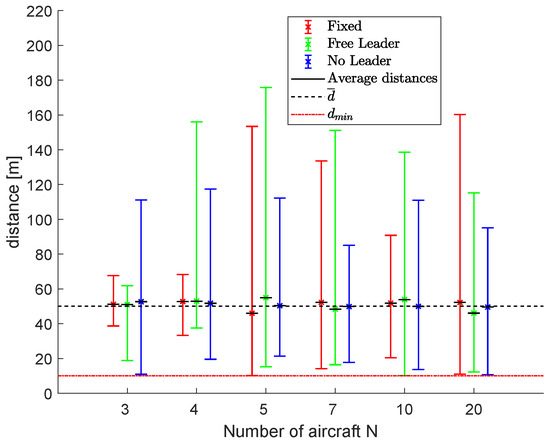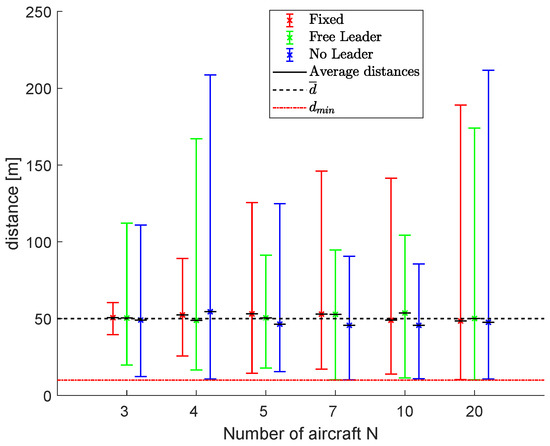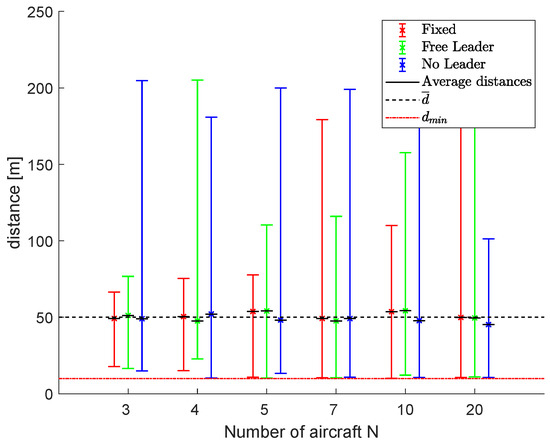 The ability of the no leader scheme to create sub-swarms is highlighted again. After the first obstacle, two separated sub-fleets were created that find a rendezvous only after the final obstacle. Figure 22 shows the results in terms of average, minimum and maximum distances, d m e a n , d m i n and d m a x , using fleets of 3, 4, 5, 7, 10 and 20 UAVs. The minimum distance is always guaranteed to be greater than the assigned safety distance d s a f e t y , while the average distance between neighboring vehicles is near the desired d ¯ .