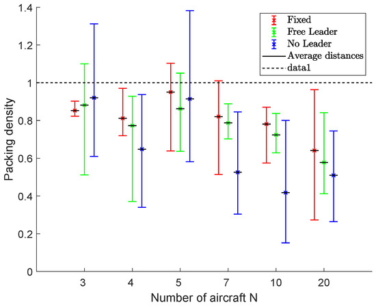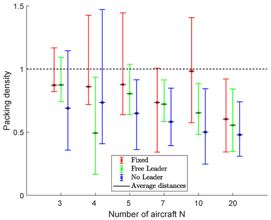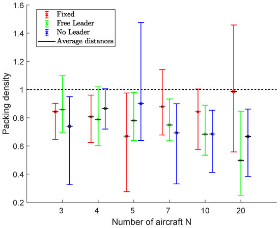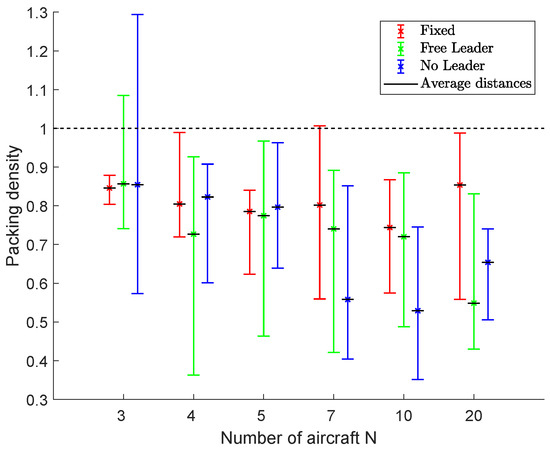 Figure 23 shows the results in terms of packing densities for fleets of 3, 4, 5, 7, 10 and 20 aircraft. The average, minimum and maximum densities are indicated by using bars to highlight algorithms’ performance during the flight.