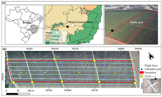 The area is located in the municipality of Patos de Minas, state of Minas Gerais, Brazil (Figure 1a), in the Cerrado biome. The local climate is classified as Aw, according to the Köppen classification [31], characterized by a tropical environment with dry winters and rainy summers. The study was conducted in a commercial coffee area of 10.24 ha, cultivated with the species Coffea arabica L., IAC Catuaí 144 variety. The coffee trees were spaced by 0.5 m between plants and by 4.0 m between rows, resulting in a density of approximately 5000 plants ha−1, with a drip irrigation system. In total, 35 rows of coffee, each approximately 760 m in length, were evaluated.