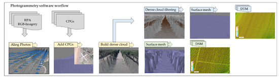 To produce the digital elevation models (DEM), the RGB images obtained were processed using Agisoft PhotoScan software (Agisoft LLC, São Peterburgo, Russia), which features a structure from motion algorithm (SfM) for the 3D digital reconstruction of scenes [32]. The workflow consists of importing the images into the software to perform image alignment, followed by the GCPs insertion to optimize the previously obtained image alignment, which provided a positional accuracy (root mean squared error—RMSE) ranging from 0.01 to 0.03 m in the horizontal axis and from 0.03 to 0.05 m in the vertical axis. Furthermore, the dense cloud can be generated and derived into a mesh surface that represents the above surface structures (DSM). In order to obtain the digital terrain model (DTM), the dense cloud previously generated needs to be filtrated, maintaining only ground-level points [19]. To define appropriate parameters for the filtering process, an empirical approach was implemented, testing different combinations of maximum angle, maximum distance and cell size, observing the correspondence to the features overlayed on the orthomosaic. Thus, the following parameters were defined: maximum angle of 1.5°; maximum distance of 0.25 m; cell size of 3 m. The selected points were then interpolated and derived into a smoothed mesh surface obtained with a five-point threshold that represents the DTM. Both the DSM and DTM were exported as a TIFF file with a 0.03 m pixel−1 fixed spatial resolution. Figure 2 presents a flowchart of image processing.