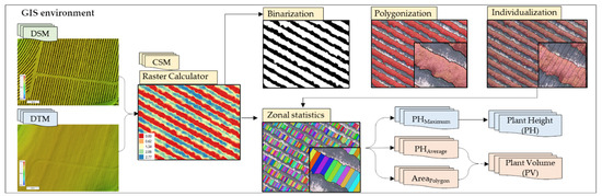 Before extracting plant height information from CSMs, we first developed a process aiming to individualize each coffee tree using QGIS (QGIS Development Team) (Figure 3). The first step consisted of clipping portions of the CSM with values ≥ 0.2 m, generating a mask feature layer separating each coffee row. Furthermore, a transversal clip at every 0.5 m (assuming regular spacing between plants) was applied to the previously obtained mask layer in order to separate each coffee plant within the row. This way, each plant was individualized based on a polygon feature maintaining the variable width metrics of every tree. Based on the obtained mask feature, zonal statistics were obtained, calculating the maximum plant height, average plant height and area within each polygon representing individual trees. By multiplying the average plant height (PH) by the area, the plant volume (PV) of each tree was then obtained.
