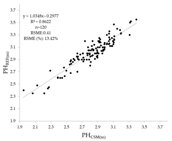 The regression model between the CSM-based plant height and reference measurements yielded an R2 of 0.86, with an RMSE = 0.41 m and an RMSE% = 13.42% (Figure 5). Some other studies that also employed RGB aerial images to assess plant height in coffee production achieved an R2 value 0.52, which is considered a moderate correlation [36], and 0.87, [22,23]. Other studies that explored the use of SfM algorithms to derive plant height information from RPA-based imagery obtained similar results in terms of precision for maize (R2 = 0.88) [16], black oat (R2 = 0.68–0.92) [37], wheat (R2 = 0.87–0.96) [6] and grassland (R2 = 0.56–0.70) [38].