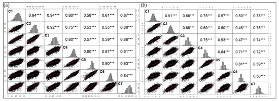Correlation matrix, *** means p-value < 0.001. (a) Among the PH data; (b) among the PV data.
