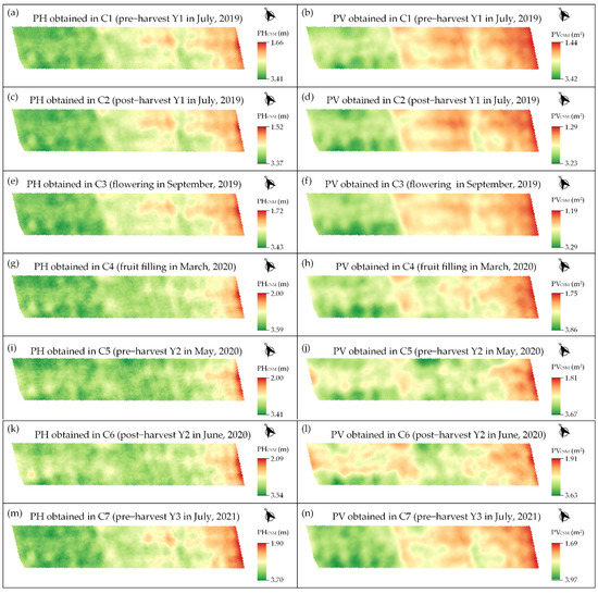 By comparing the PV and PH maps from the same campaign, it is possible to observe that they have some differences in spatial behavior. The PV data present a greater definition of areas with a high (regions in green) and low (regions in red) volume of plants, consequently presenting higher CV values (Table 2) in comparison with the PH datasets. The behavior observed in the PH maps is repeated in the PV maps. Starting with C4, it is possible to identify that the area presents a distinct behavior in comparison with collections C1, C2, C3 and C7, also presenting some isolated regions that previously presented a low volume (regions in red) in collections C1, C2, C3 and C7. During C4, C5 and C6, the same regions presented inverse behavior with a high volume (regions in green). This inversion may be linked to the biennial behavior of the plant, which presents opposite behaviors in years of high and low yield [44,45].